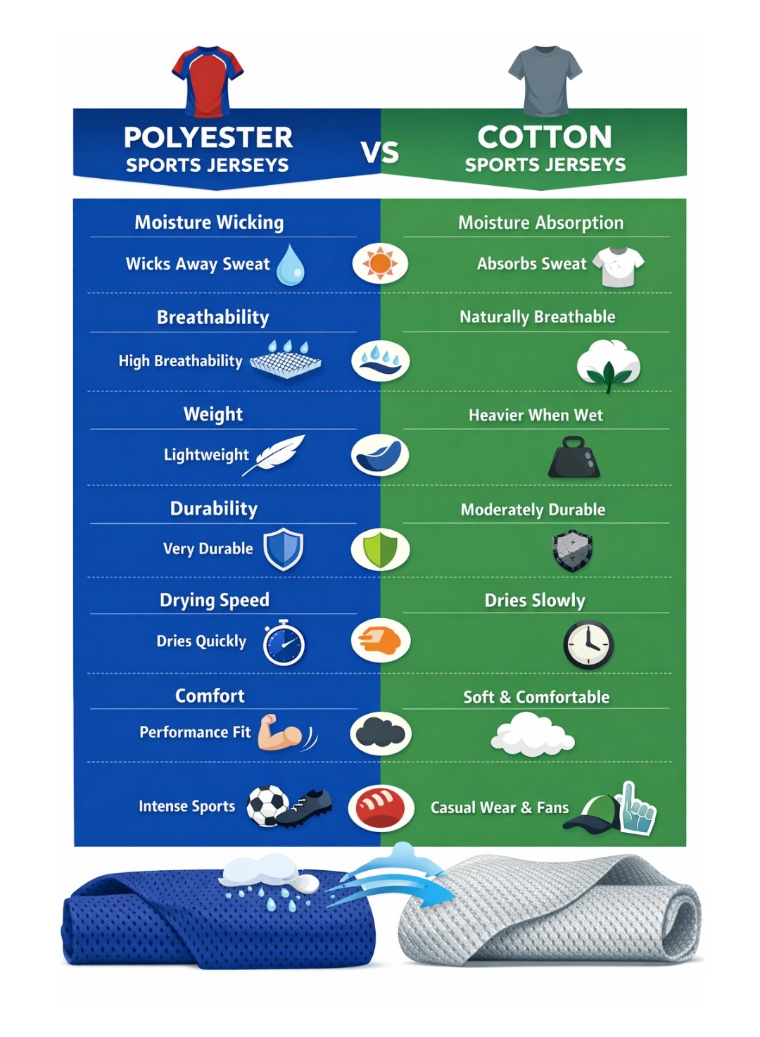 In this comprehensive guide, we will break down the real differences between polyester sports jerseys and cotton sports jerseys, compare their performance in different sports and climates, and help you confidently choose the right fabric for your needs.